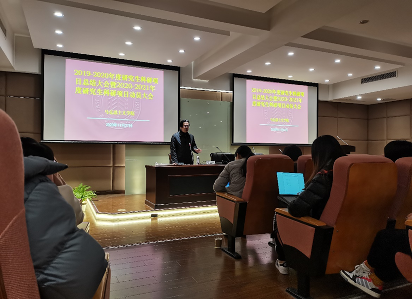 崔海英传达了关于开展2020—2021年成人影院 研究生科研项目立项申报工作的通知,并对2019—2020年度研究生项目的申报、立项及结项情况进行了总结。崔老师强调,本次科研项目立项没有名额限制,选题合理、论证较佳的项目都有机会予以立项并给予资金资助,鼓励同学们积极选取马克思主义经典著作、习近平新时代中国特色社会主义思想研究等重点方向进行探索思考。随后,崔老师为2019—2020年度研究生科研项目获奖的同学进行了颁奖。